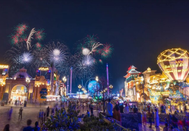 At the center of the project, a glowing spherical structure rises 30 meters high, surrounded by a basin of flowing water. Around it are over 100 AI-powered displays, creating streams that reach heights of up to 75 meters.